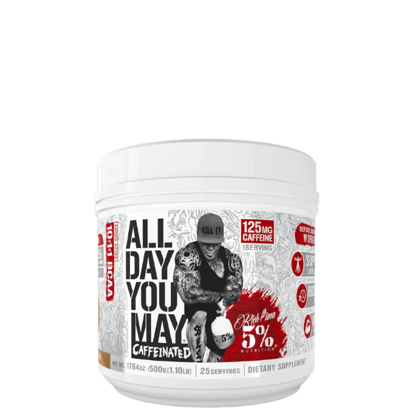 The All Day You May caffeinated BCAA supplement combines essential amino acids with natural energy support for muscle recovery, focus, and endurance. Featuring a unique Vanilla Iced Coffee flavor, this formula is perfect for athletes who want amino acids plus a clean caffeine boost.